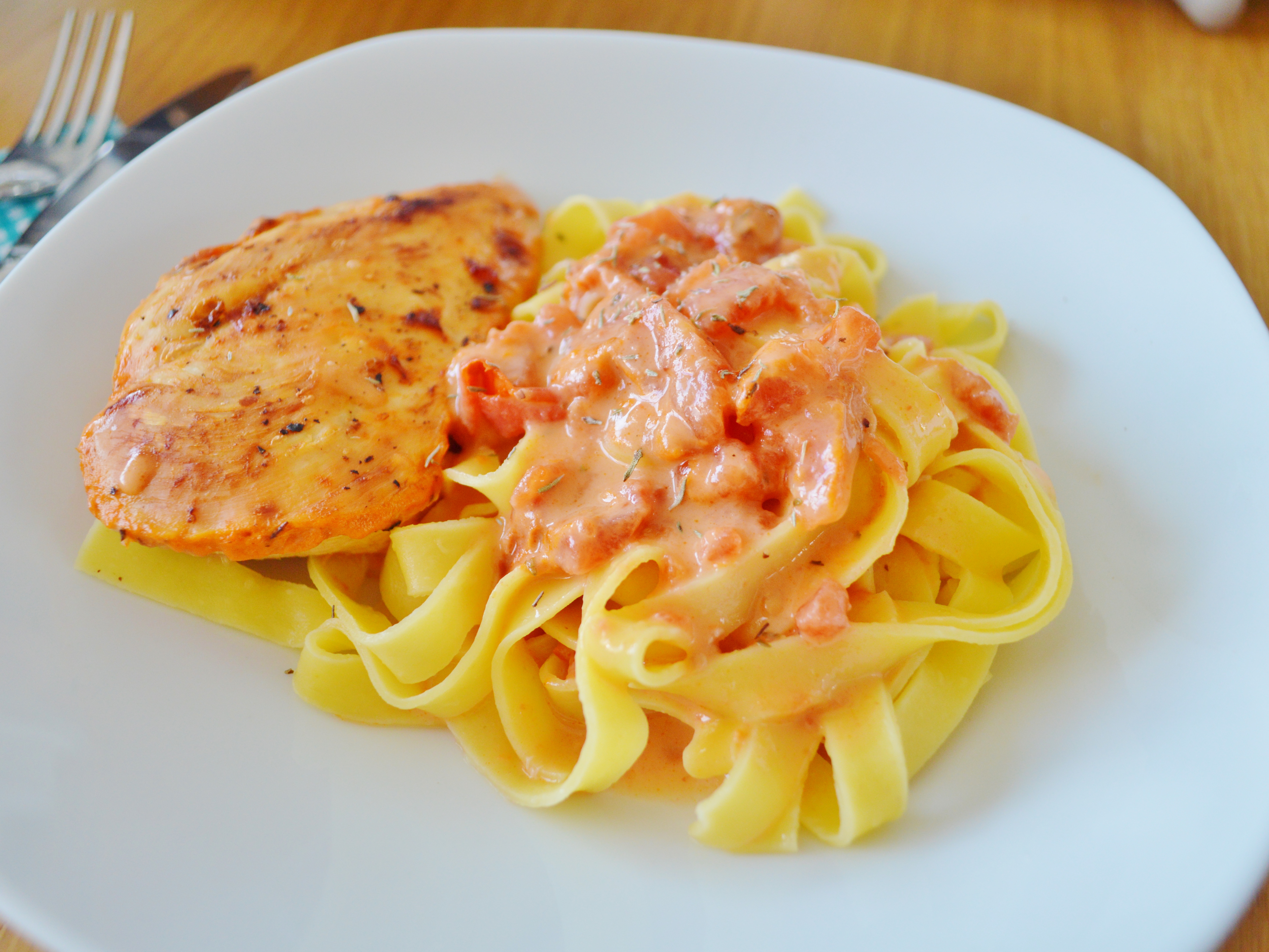 Don’t you know that feeling when you’re just hungry after work and don’t know what to make for dinner? It’s tempting to just order a pizza or other take-out, but really you’d like something good? Well, look no further. This is a recipe my mom once found somewhere and adapted it over the years, and it’s sooooo delicious! I’ve made this for guests, too, and people love it. Plus, it’s super simple to make! Just throw the ingredients together and pop it in the oven. It’s pan-fried chicken breasts in a creamy vermouth-tomato-sauce with thyme, but that was a bit too long to put in the title. Served over fresh tagliatelle, maybe with a green side salad – perfection.